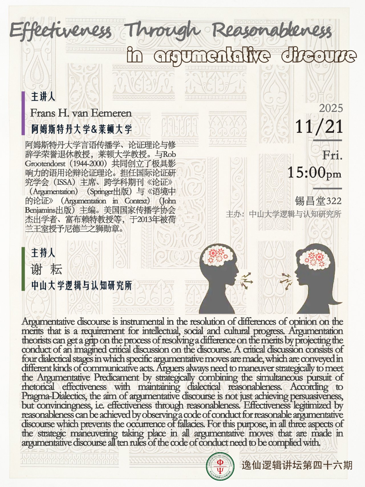 逸仙逻辑讲坛第四十六期|Frans H. van Eemeren:论证话语中的合理性与取效性