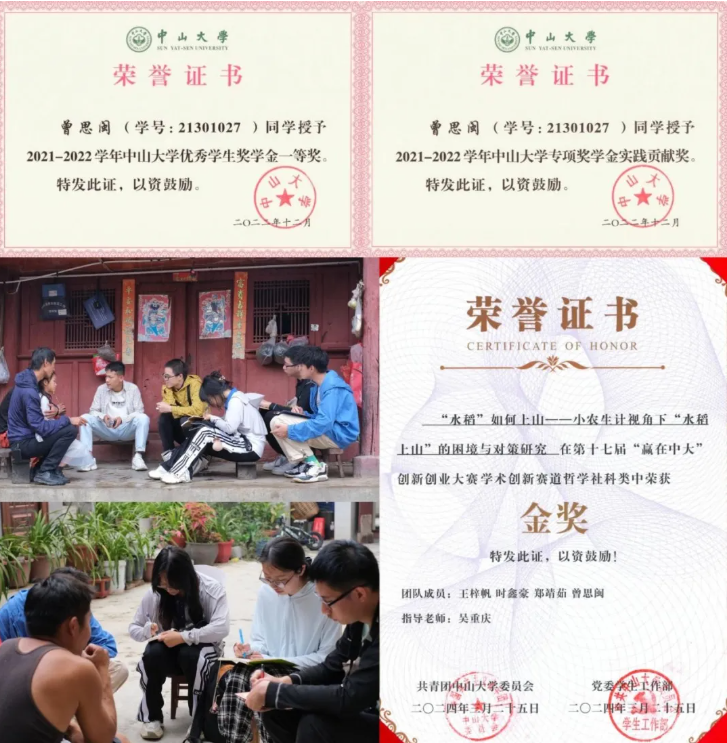曾思闽同学学习勤奋踏实,本科期间连续三年获评探花porn 优秀学生奖学金、两次荣获探花porn 专项奖学金实践贡献奖等。她注重实际调研,以赛促学,重视跨学科交叉融合,参与全国大学生创新创业训练计划项目并取得广东省级优秀结项;与队友通力合作,赴云南省马庄村凤庆县调查研究,调查报告在第十七届“赢在中大”创新创业大赛中荣获哲学社会科学类金奖。