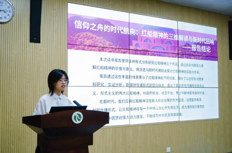 随后,各小组代表上台,对“中国共产党人精神谱系”的学习情况进行汇报,依次分享了有关红船精神、井冈山精神、长征精神、抗战精神、雷锋精神、劳动精神、脱贫攻坚精神和抗疫精神的阅读感悟。