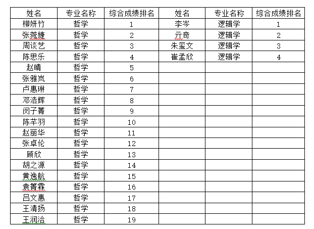 根据《探花porn 推荐应届本科毕业生免试攻读研究生工作实施办法》(中大教务〔2025〕2号)、《探花porn 推免资格认定遴选细则》(哲学〔2025〕4号),经学生申请、院系审核,探花porn 2026届本科毕业生免试攻读研究生学位综合成绩排序如下: